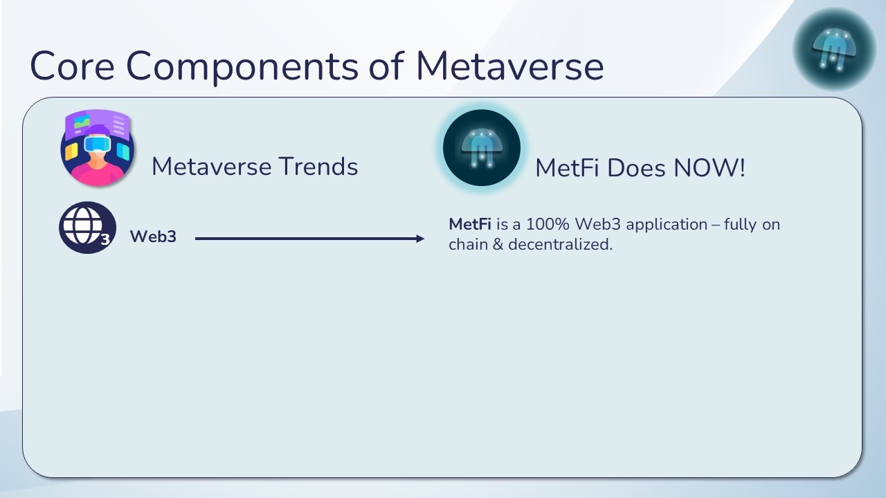 MetFi puts the power of blockchain opportunity into the hands of regular people who are incentivized for their support through a fully decentralized rewards system that operates through smart contracts.